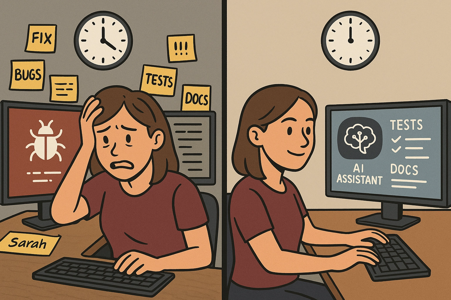 This is Sarah, a senior developer working at a fintech startup that’s growing quickly. Her small team was struggling with technical debt – they were quickly releasing new features but skipping tests and documentation along the way. Code reviews were hurried, and critical bugs often made it into production.