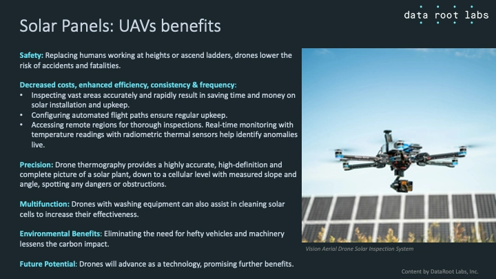 Traditional solar field assessments consist of inspecting each panel with handheld thermal imagers to check for defective cells or cables. UAVs, equipped with high-resolution cameras and thermal imaging technology, make solar inspections significantly faster, cheaper, safer, more effective, and more precise. Here is a summary of the potential benefits of deploying UAVs for the solar energy sector: