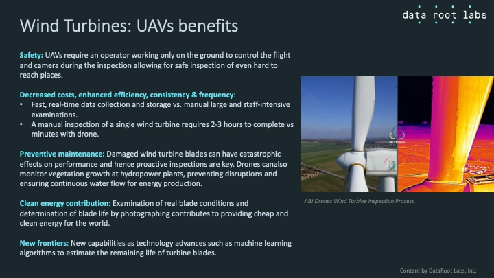 | ABJ Renewables | USA / 2015 | - | - | ABJ Renewables provides commercial drone solutions for the energy industry. The company provides services including thermal and optical imaging, 3D imaging, solar and wind farm inspections, law enforcement services including surveillance and pursuits, and commercial videography. |