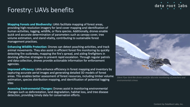 | AirForestry | Sweden / 2020 | $3.1M / Seed | Vinnova, Walerud Ventures, Länsförsäkringar | Developer of electric harvesting drone intended for forest management. The company's technology is used as a harvesting tool and to thin trees while contributing to reducing carbon dioxide emissions from forestry work while increasing the forest's ability to sequester carbon, enabling forest to grow and be able to store more carbon, which is vital in the fight against climate change. |